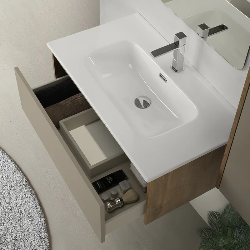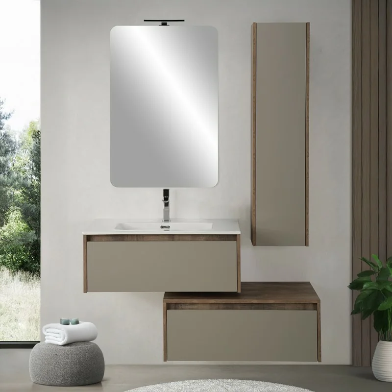 Mobile bagno sospeso 80 cm in legno tabacco e tortora con lavabo e specchio Smok