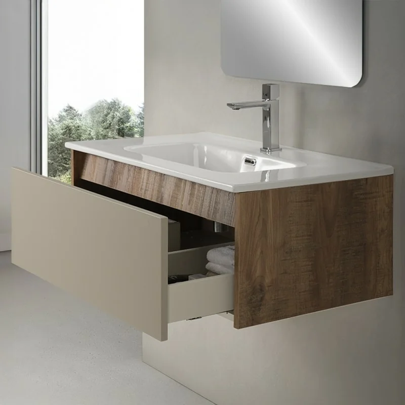 La linea Smok unisce il calore del legno all’eleganza della finitura tortora opaca creando una sensazione di accoglienza, calma e praticità nel tuo ambiente bagno.