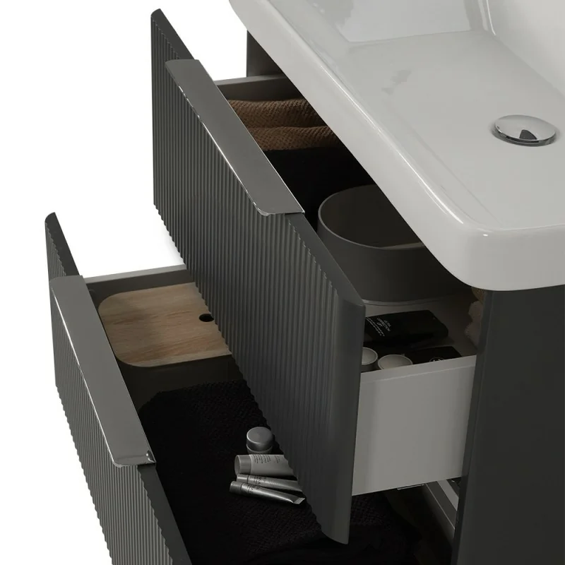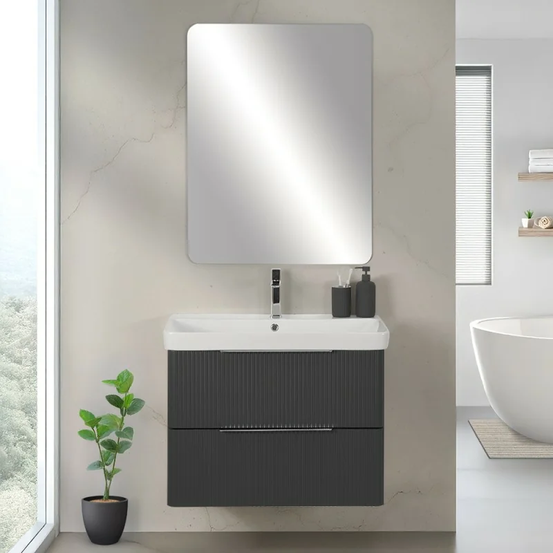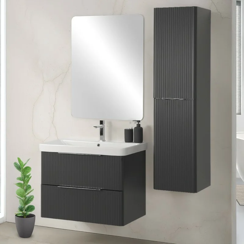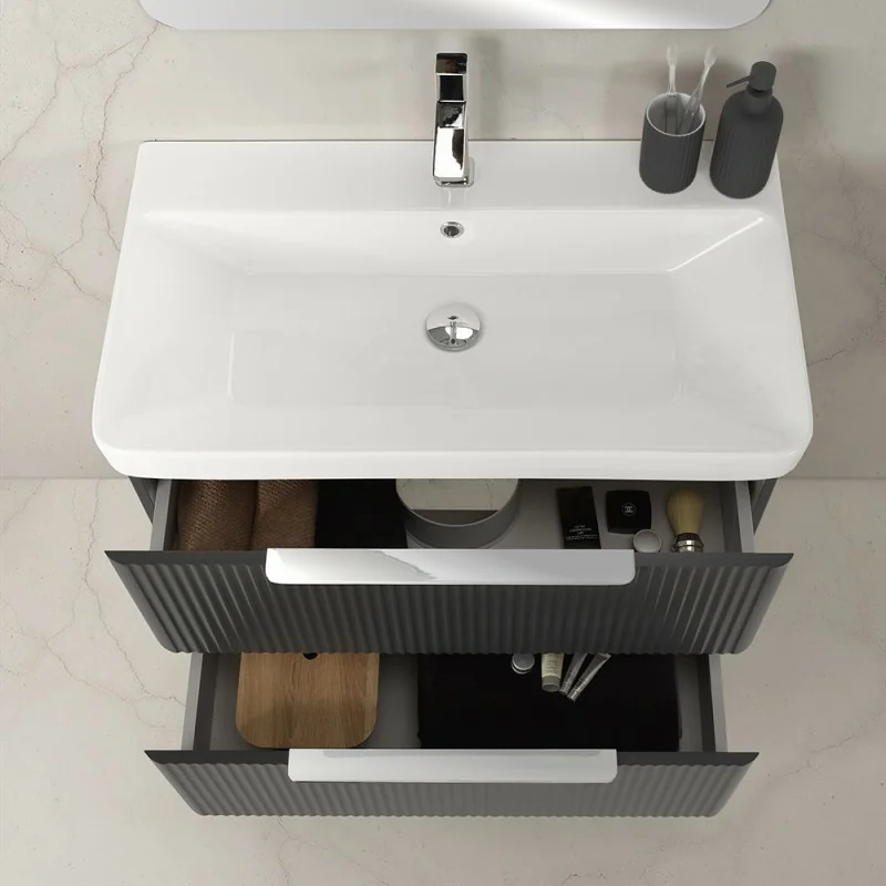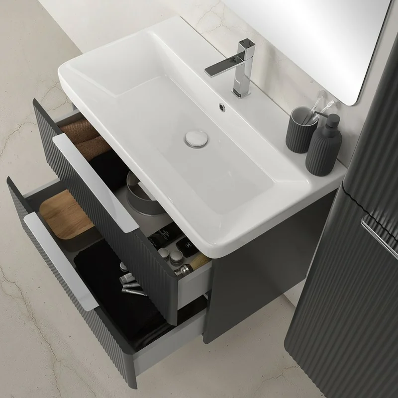 Mobile bagno sospeso 80cm antracite cannettato con cassetti, specchio e lavabo Mia