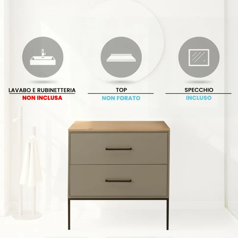 Mobile bagno sospeso 80cm tortora con due cassetti e specchio Brik