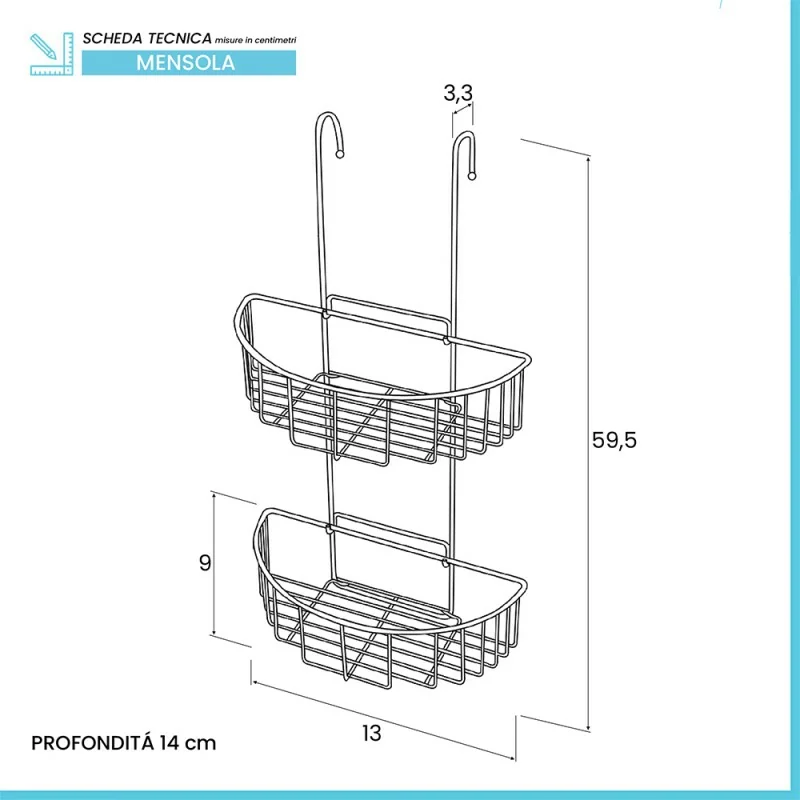 La mensola doccia è un cestino portaoggetti con ganci,da appendere con estrema facilità a qualsiasi colonna o saliscendi doccia,ideale per contenere con ordine e sicurezza tutti i prodotti per la doccia.