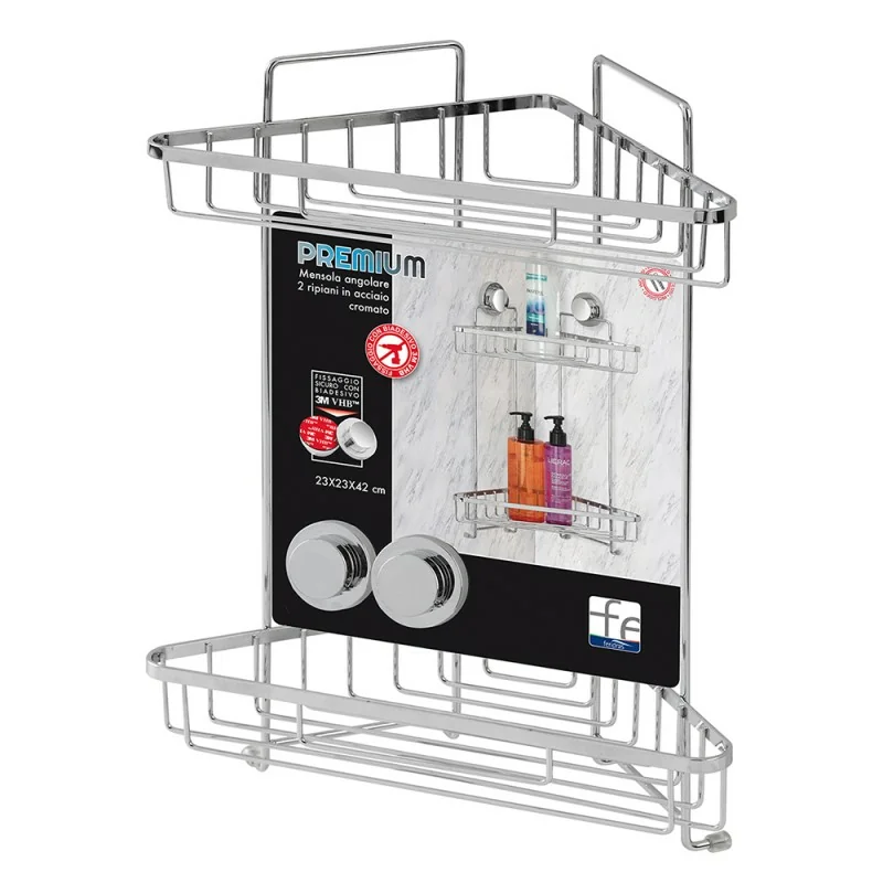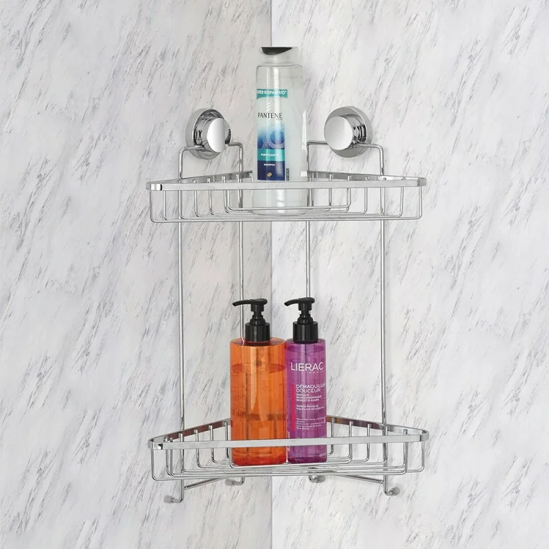 Mensola doccia angolare cromata con 2 ripiani e doppio fissaggio