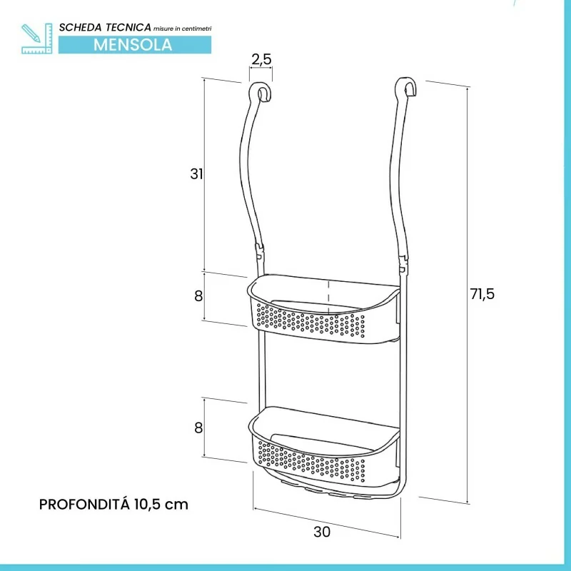 Mensola doccia bianco in PVC con 2 ripiani e ganci inferiori scheda Mensola doccia bianco in PVC con 2 ripiani e ganci inferiori