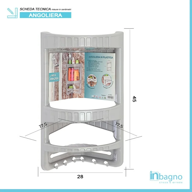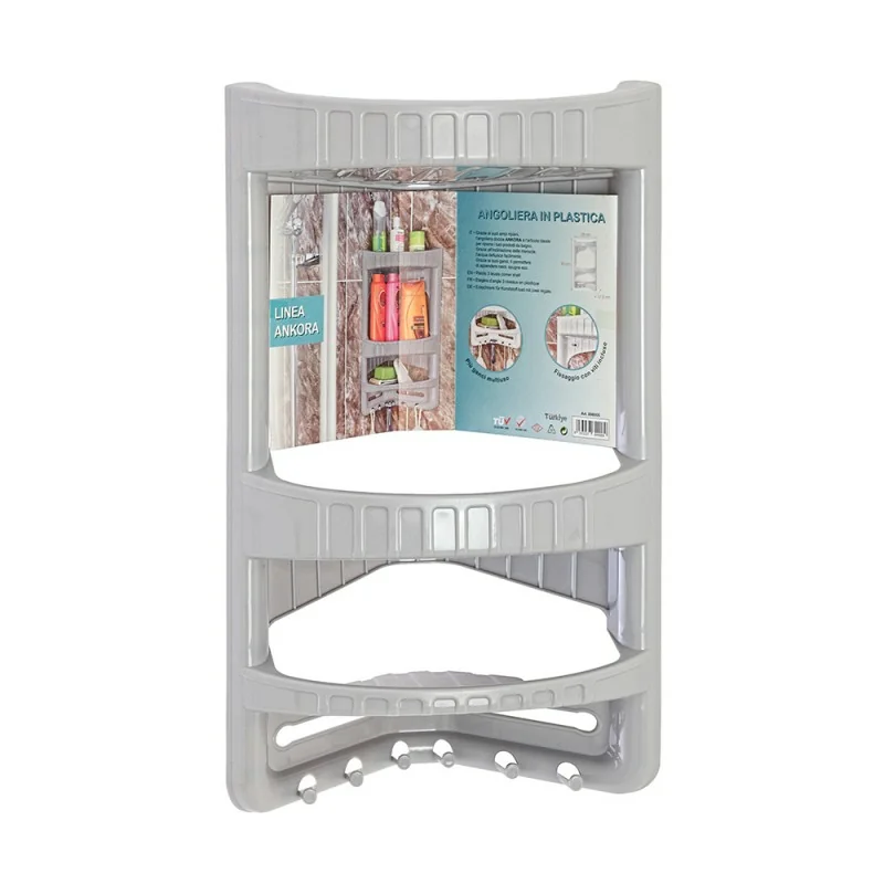 Angoliera doccia plastica grigia con 3 ripiani e ganci portaoggetti Scheda tecnica mensola angolare doccia con 3 ripiani e ganci portaoggetti in plastica grigia