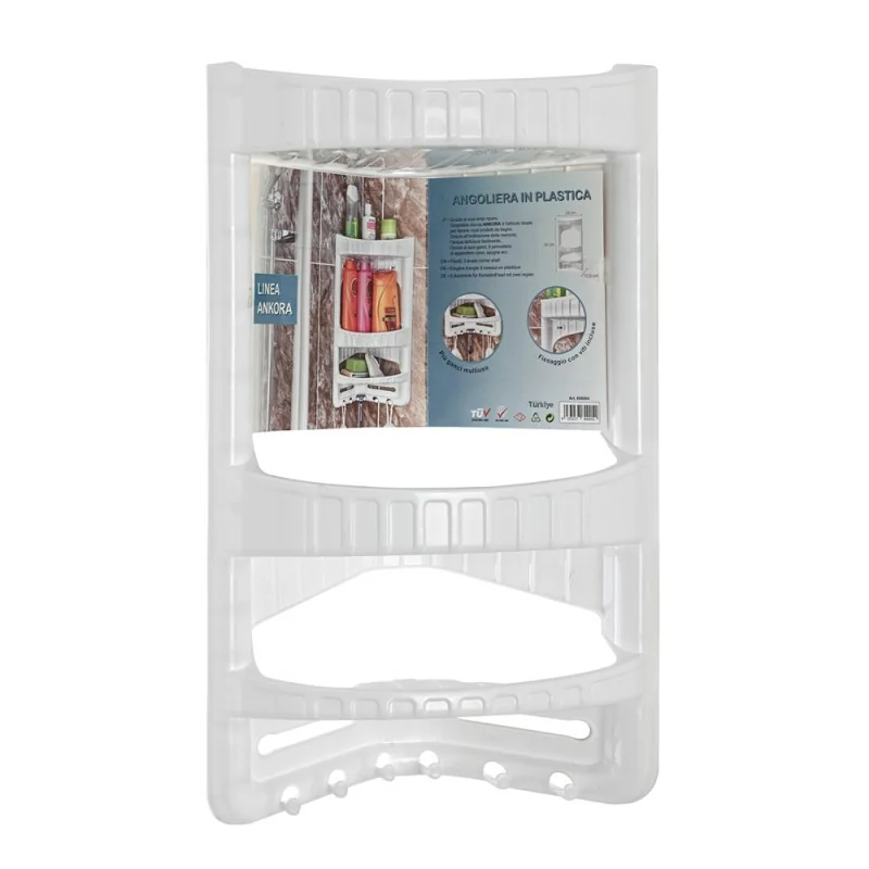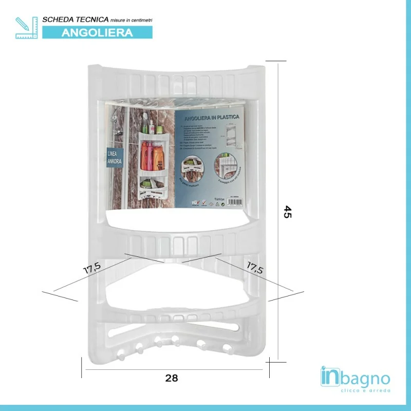 Angoliera doccia plastica bianca con 3 ripiani e ganci portaoggetti Scheda tecnica mensola angolo doccia in plastica bianca con 3 ripiani e ganci multiuso