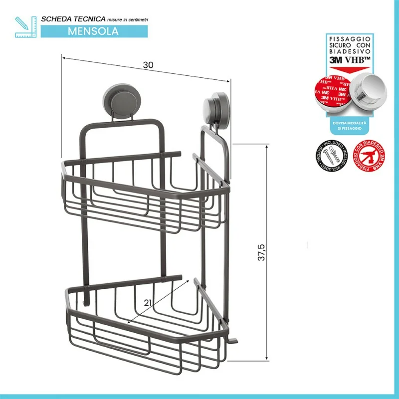 La mensola proposta è un portaoggetti doccia dalla forma angolare, da installare direttamente a parete sia col biadesivo 3M incluso che con viti e fischer sempre inclusi. La griglia doccia è realizzata in acciaio con due ripiani particolarmente capienti, caratterizzati da griglie vuote che consentono il drenaggio dell’acqua ed evitano l’assenza di uno spiacevole ristagno.