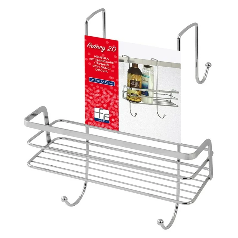 Mensola doccia con gancio e ripiano portaoggetti in acciaio cromato