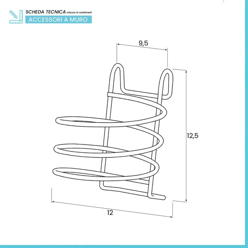 Il porta phon a spirale è la soluzione ideale,universale e innovativa che consente di collocare l’asciugacapelli in maniera sicura e ordinata:è realizzato in acciaio di qualità,materiale in grado di assicurare la massima durabilità e resistenza del prodotto.