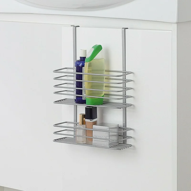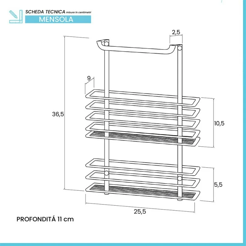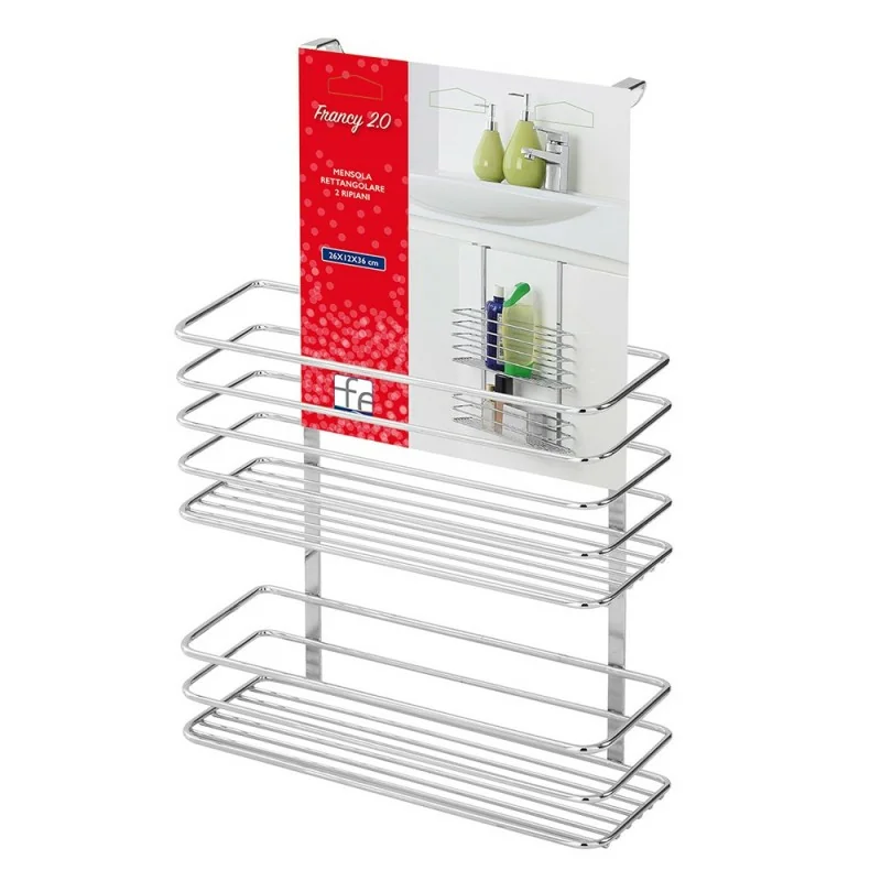 La griglia rettangolare vanta due ripiani particolarmente capienti e un’installazione semplice e intuitiva:basterà appendere a qualsiasi porta o box doccia la mensola,dotata di appositi ganci laterali.