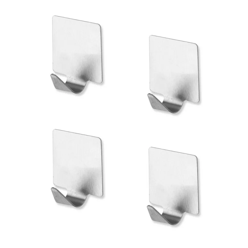 I ganci sono quattro,realizzati in acciaio con particolare finitura satinata;hanno libera installazione,progettati per essere installati con facilità anche su superfici come piastrelle,metallo,vetro o legno. Non occorre foratura,la confezione include il fissaggio con adesivo.