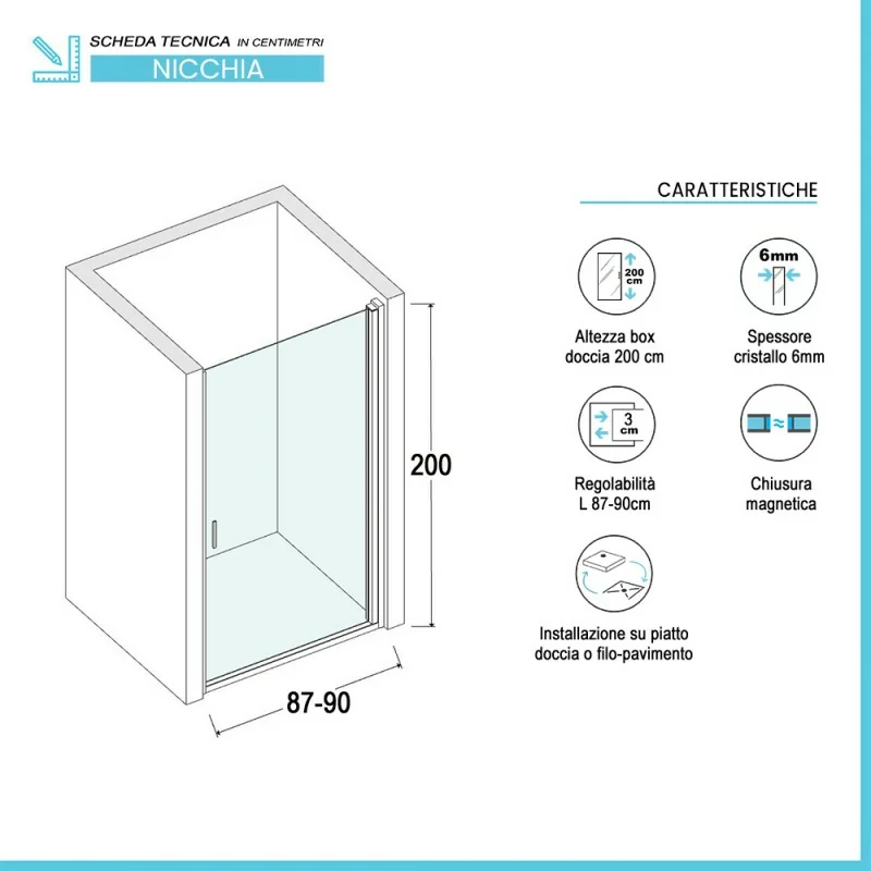 L’installazione in nicchia può avvenire sia filo pavimento che su tutti i tipi di piatti doccia,in ceramica,composito di marmo o acrilico,rispettando la tolleranza di regolazione pari a 3 cm. La porta doccia è a battente con apertura da destra,dotata di chiusura magnetica lungo tutto l’altezza,ideale per evitare la fuori uscita dell’acqua.