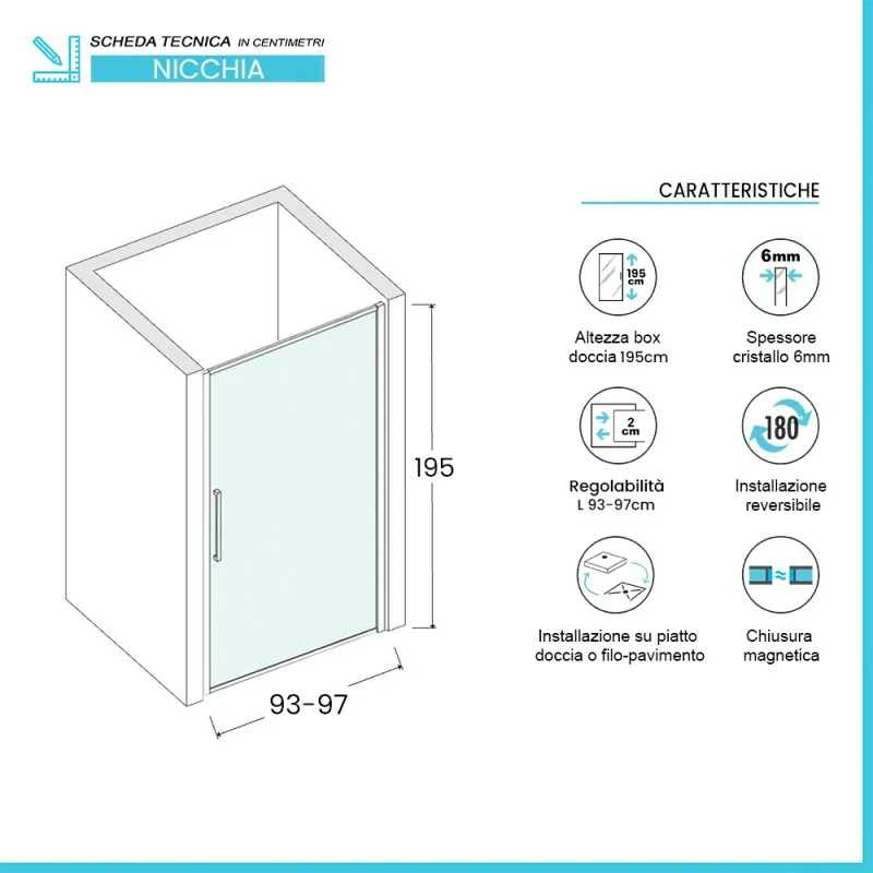• Tipologia: box doccia nicchia con porta battente;