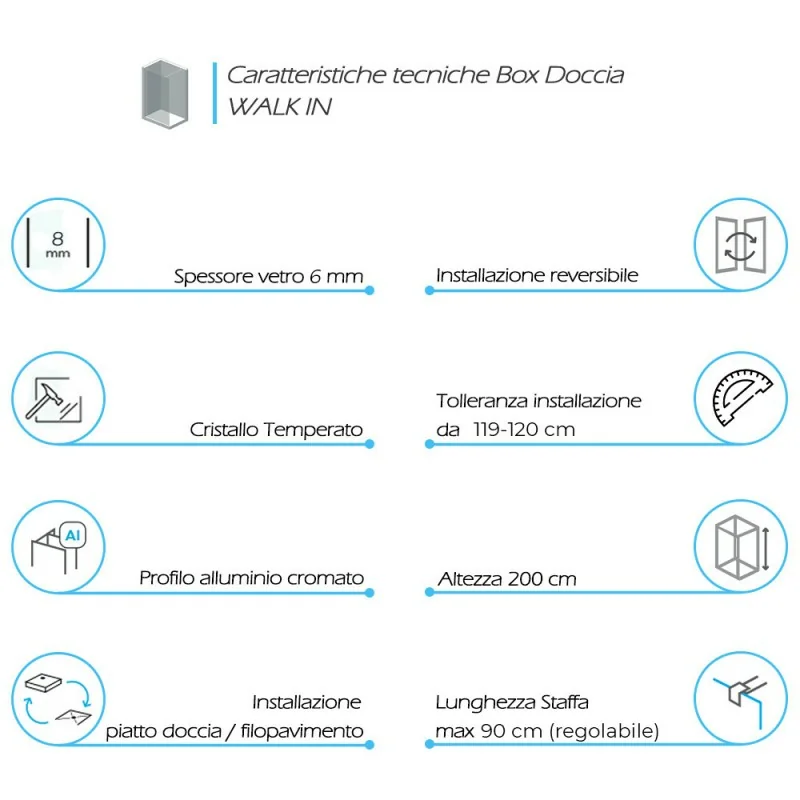 Oltre all’impatto estetico e luminoso,l’assenza di binari e cerniere nei Walk-In riduce notevolmente la frequenza di pulizia e manutenzione periodica. La parete è realizzata in cristallo temperato con spessore pari a 6 mm,ideale per garantire la massima sicurezza nell’utilizzo quotidiano e facilmente installabile filo-pavimento e su piatto doccia,rispettando la tolleranza di regolazione.