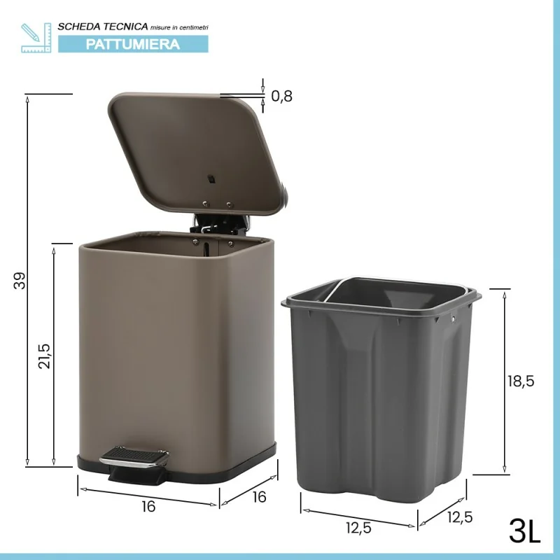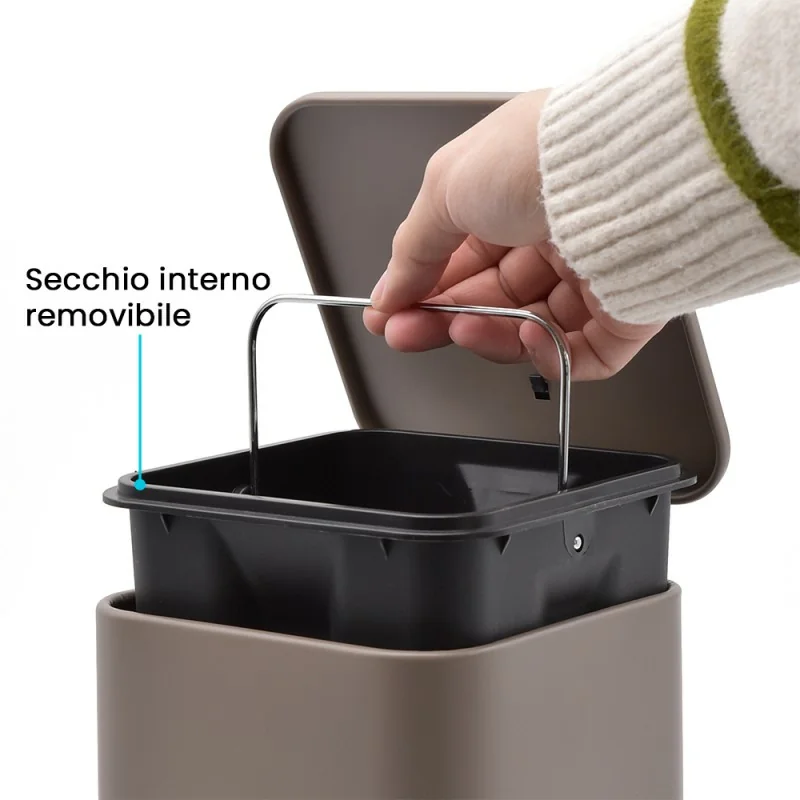 Il cestino è dotato di secchio interno removibile con comoda maniglia cromata,ideale per svuotare con rapidità i rifiuti;la rimozione del secchio interno è utile anche per fissare il bordo della busta della spazzatura. L’apertura della pattumiera è pratica e igienica:basta applicare una leggera pressione sul pedale del cestino,senza usare le mani.