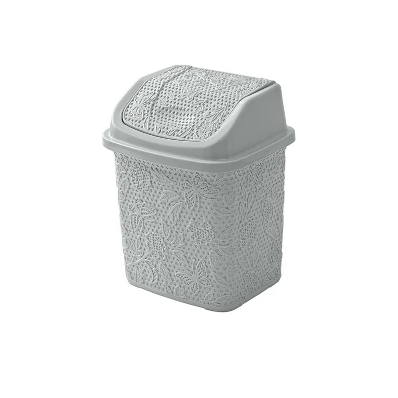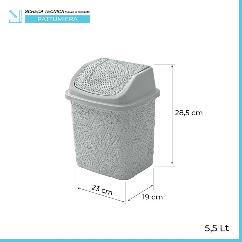 Splendido e funzionale, questo cestino da bagno da 5,5 litri in plastica dalla finitura grigia si distingue per il suo delicato motivo a intreccio con intarsi floreali. Il coperchio basculante assicura igiene e discrezione, celando il contenuto con stile. Perfetto per aggiungere un tocco di eleganza e praticità al tuo bagno, ottimizzando lo spazio con un design curato e raffinato. Un accessorio che unisce bellezza e utilità.