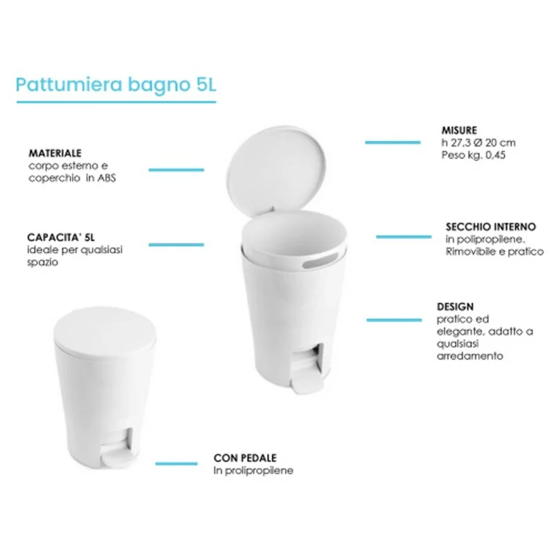 Pattumiera da bagno moderna con coperchio in ABS e pedale bianco capienza 5 litri