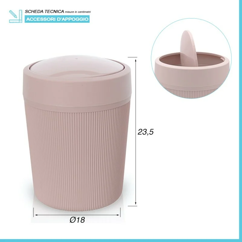 La pattumiera bagno della linea Ring è realizzata in plastica di colore rosa,la sua struttura compatta e salvaspazio permette di posizionarla anche in angoli ristretti della casa,lasciando un ingombro minimo.