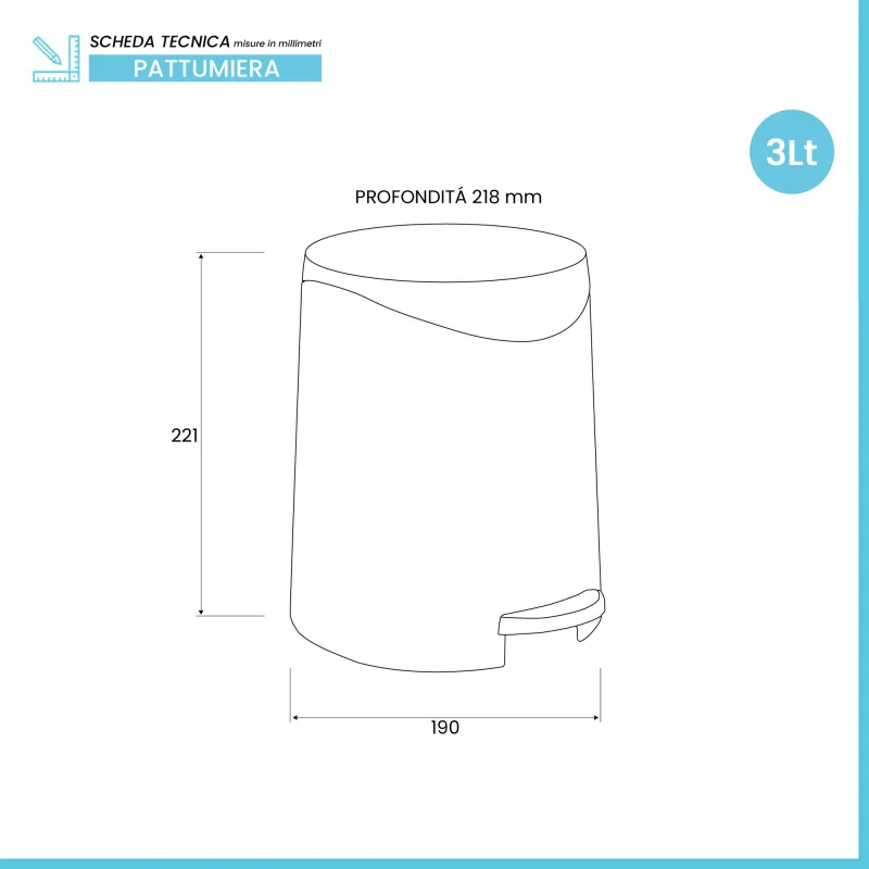 Pattumiera da bagno con pedale 3lt nera opaca in plastica Pattumiera da bagno con pedale 3lt nera opaca in plastica aperta scheda tecnica pattumiera da bagno con pedale 3lt nera opaca in plastica Fronte pattumiera da bagno con pedale 3lt nera opaca in plastica