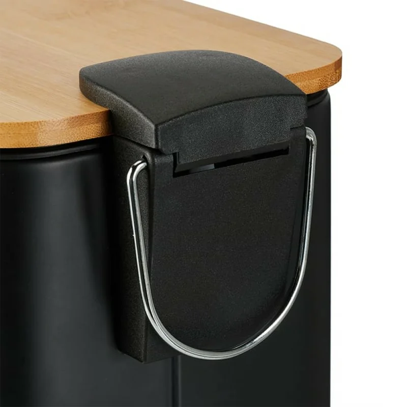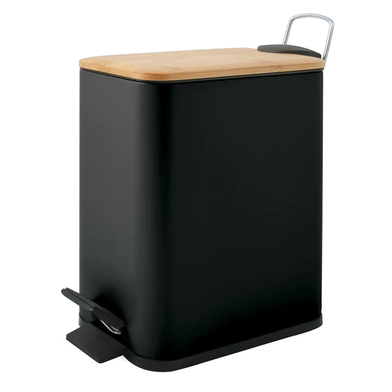 Pattumiera bagno 5 L in acciaio con coperchio in bambù nera con apertura a pedale Rexa
