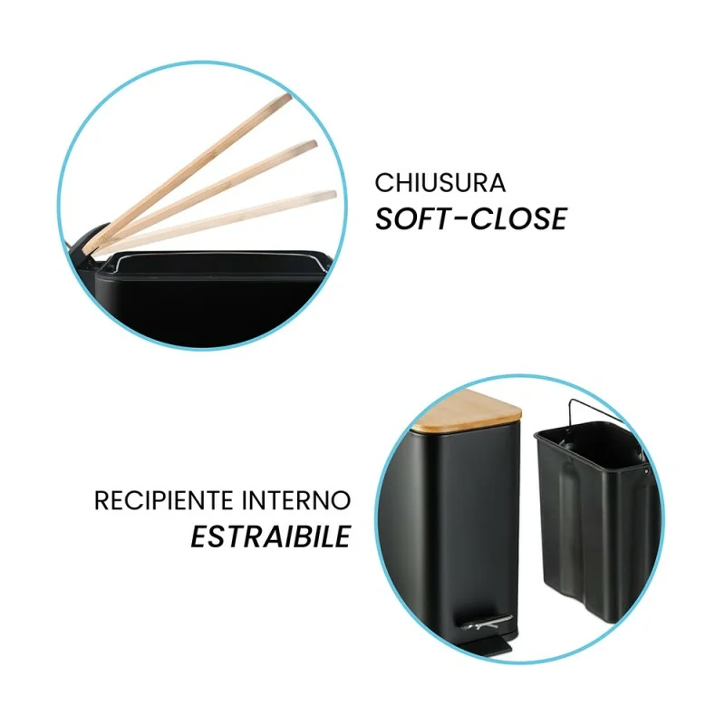 Cestino gettacarte bagno 5 Lt in acciaio nera con coperchio in bambù con apertura a pedale linea Rexa   Eleva lo stile e la funzionalità del...