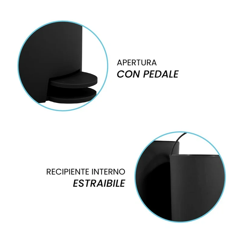 Eleva lo stile e la funzionalità del tuo bagno con la Pattumiera Orbix da 3Lt nero  con apertura a pedale. Il suo esterno anti-impronta garantisce un aspetto sempre impeccabile, il secchio interno estraibile rende lo svuotamento igienico e la chiusura soft-close assicura silenziosità. È la soluzione ideale per chi cerca un design raffinato e la massima praticità.