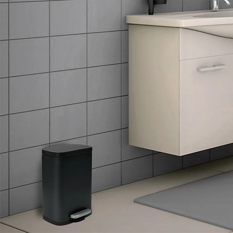 La linea Axin è pensata per chi cerca accessori da bagno pratici, durevoli e dal design essenziale, perfetti per ambienti moderni e curati nei dettagli. Questa pattumiera dal design rettangolare da 5 litri è realizzata in acciaio nero opaco anti-impronta, con finitura elegante e sempre ordinata al tatto e alla vista. Il coperchio con chiusura rallentata evita rumori bruschi, mentre il pratico pedale e il secchio interno estraibile in plastica riciclata lo rendono facile da usare e da pulire.