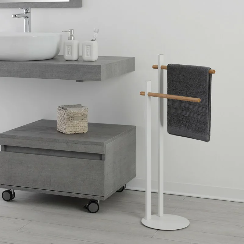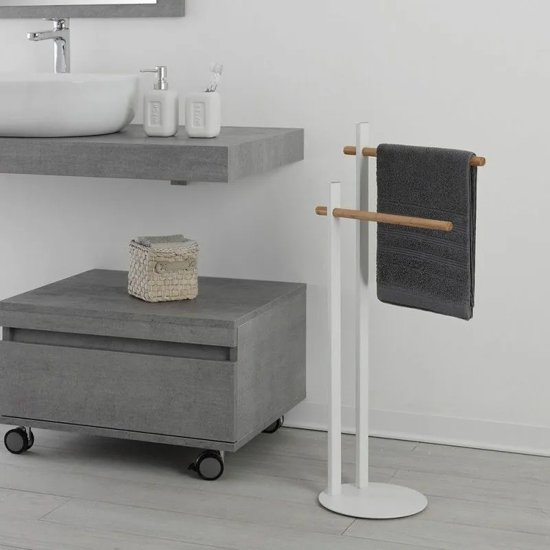 Piantana Bagno Portasciugamani Bianca in Metallo e Bambù