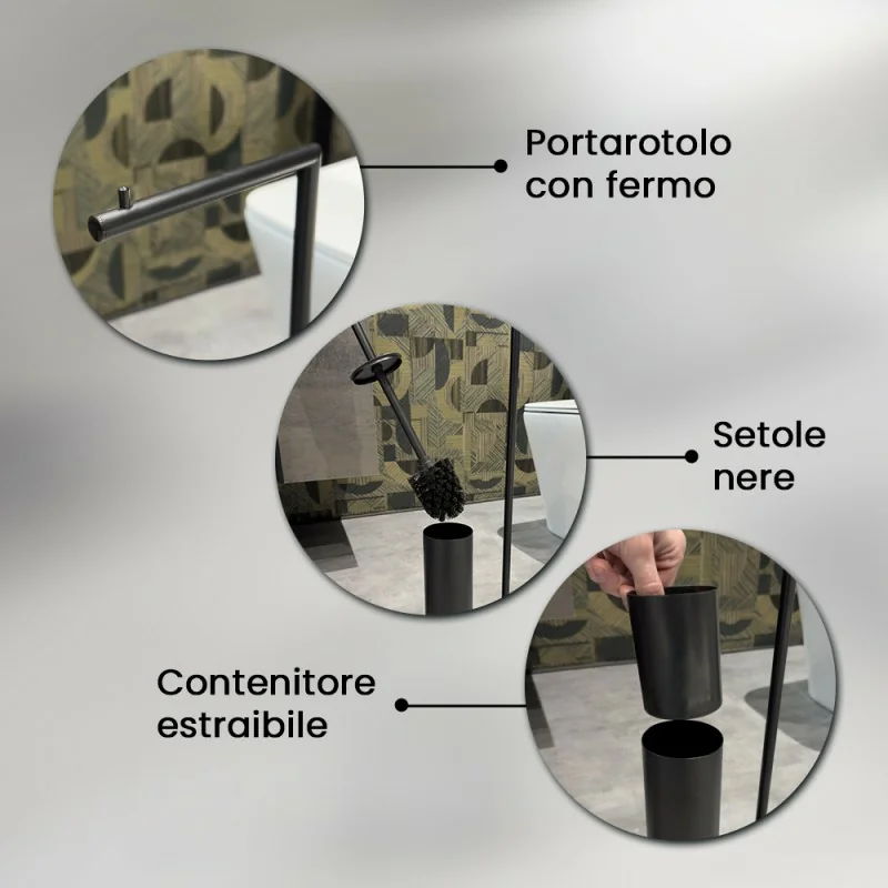 Piantana porta rotolo e porta scopino Style in acciaio nero opaco con base circolare