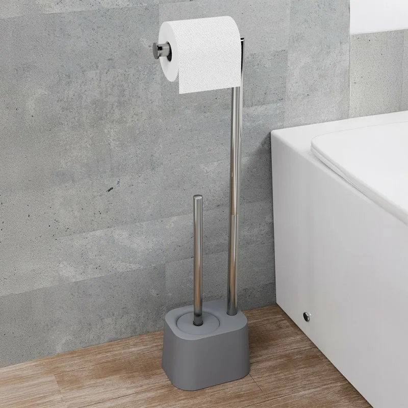 La piantana portarotolo e portascopino della linea Glim unisce semplicità e funzionalità in un design compatto e moderno. La base in plastica grigio opaco, stabile e facilmente lavabile, si abbina agli inserti in acciaio cromato che donano un tocco brillante e contemporaneo all’ambiente bagno. La struttura slanciata con base rialzata ottimizza gli spazi e mantiene tutto in ordine, perfetta anche per bagni di piccole dimensioni.