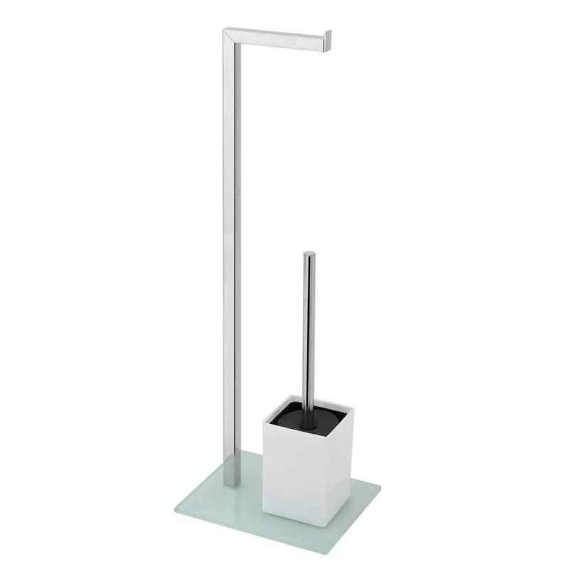 Piantana porta scopino e porta rotolo in acciaio Cromo con base in Vetro Temperato