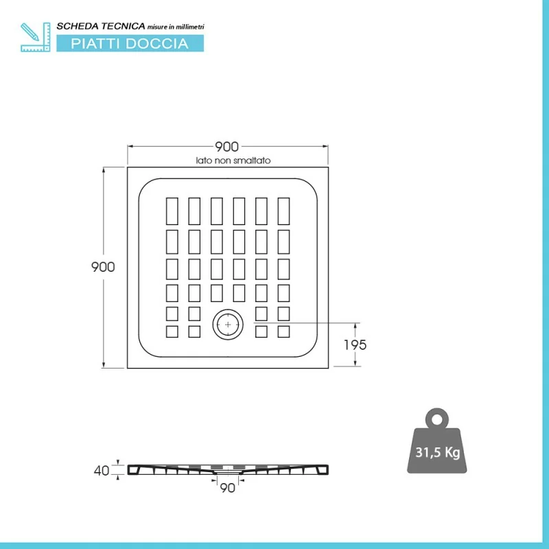 Piatto doccia – 90x90 cm H 4 cm quadrato in ceramica bianca con antiscivolo serie Cube