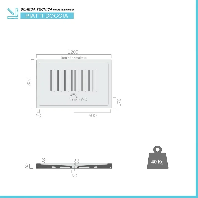 Piatto doccia – 80x120 cm H 6 cm rettangolare in ceramica bianca con antiscivolo