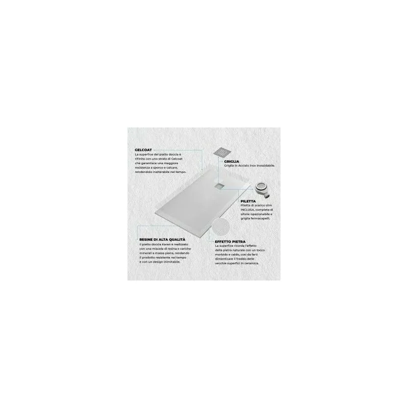 Il piatto doccia rettangolare 80x160 cm Karen è il prodotto ideale per contemplare la propria zona doccia, dispensando profonde note di modernità e raffinatezza. Viene realizzato attraverso l'impiego di una miscela di resina e cariche minerali a pasta unica. L'estrema resistenza è data da due fattori cruciali:una struttura a massa piena e l'applicazione sulla superficie di uno strato di Gelcoat,antibatterico, che lo rende inalterabile nel tempo. Il piatto doccia con le sue variegate scelte d'installazione può essere posato su pavimento,su massetto in cemento o a filo pavimento (scelta pratica dovuta all'altezza di soli 3 cm del piatto). Dando un'occhiata al lato comfort, 3il prodotto è molto facile da pulire e presenta una texture antiscivolo per la massima sicurezza d'uso,tutto ciò accompagnato da una sensazione piacevole al tatto.