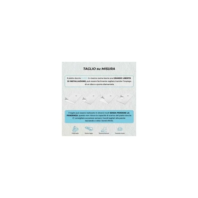 Il piatto doccia è facilmente tagliabile tramite l'uso di un disco a punta diamantata. Il taglio può essere realizzato in diversi modi senza perdere le pendenze,quindi senza ridurre la capacità di scarico del tuo piatto doccia.