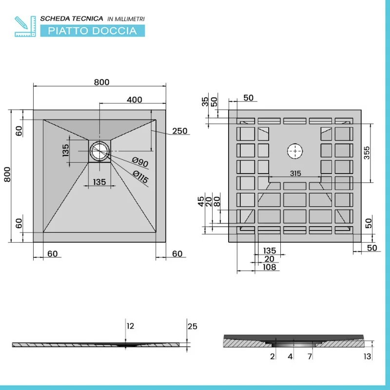 Piatto doccia resina quadrato 80x80 cm filo pavimento con spessore 2,5 cm bianco pietra completo di griglia