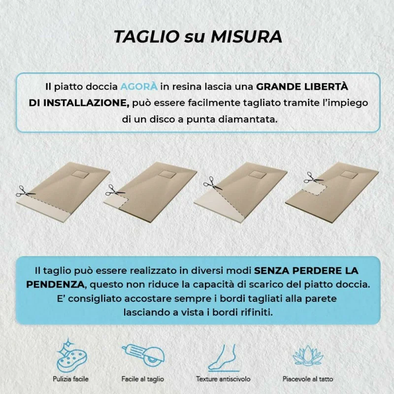Piatto doccia 80x100 filo pavimento Agorà in resina pietra tortora Piatto doccia 80x100 riducibile in resina pietra tortora serie Agorà Piatto doccia Agorà 80x100 su misura in resina tortora effetto pietra Scheda tecnica piatto doccia 80x100 filo pavimento Agorà in resina pietra tortora Caratteristiche peculiari piatto doccia Agorà Piatto doccia Agorà tagliabile su misura tramite disco a punta diamantata Superficie con effetto pietra e texture antiscivolo del piatto doccia Agorà Piatto doccia resina 80x100 rettangolare Agorà tortora effetto pietra