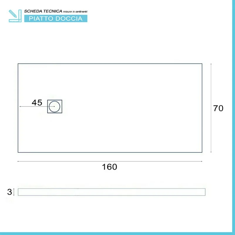 Piatto doccia – filo pavimento 70x160 cm e spessore 3 cm,riducibile su misura con griglia e piletta di scarico