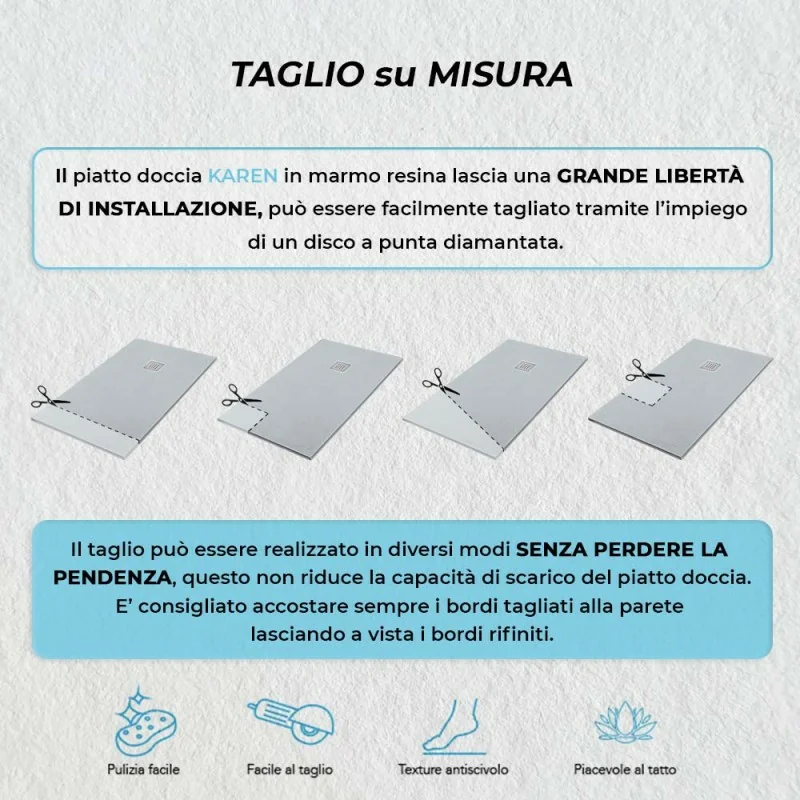 Il piatto doccia è facilmente tagliabile tramite l’uso di un disco a punta diamantata;il taglio può essere realizzato in diversi modi senza perderne le pendenze,senza ridurre la capacità di scarico del piatto doccia.