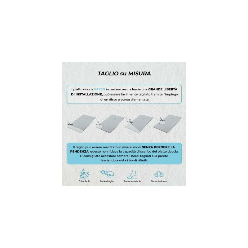 Il piatto doccia è facilmente tagliabile tramite l'uso di un disco a punta diamantata. Il taglio può essere realizzato in diversi modi senza perdere le pendenze,quindi senza ridurre la capacità di scarico del tuo piatto doccia.