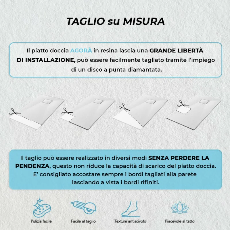 Il piatto doccia è facilmente tagliabile tramite l’uso di un disco a punta diamantata;il taglio può essere realizzato in diversi modi senza perderne le pendenze,senza ridurre la capacità di scarico del piatto doccia.