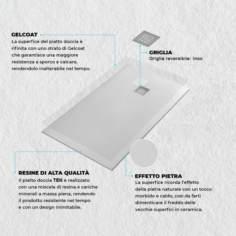 I piatti doccia della linea Ten si contraddistinguono per la loro texture in pietra naturale che,oltre ad essere funzionale,è in grado di regalare un’esperienza di doccia unica e rilassante;installabili in appoggio o filo pavimento,sono disponibili in diverse misure e finiture.