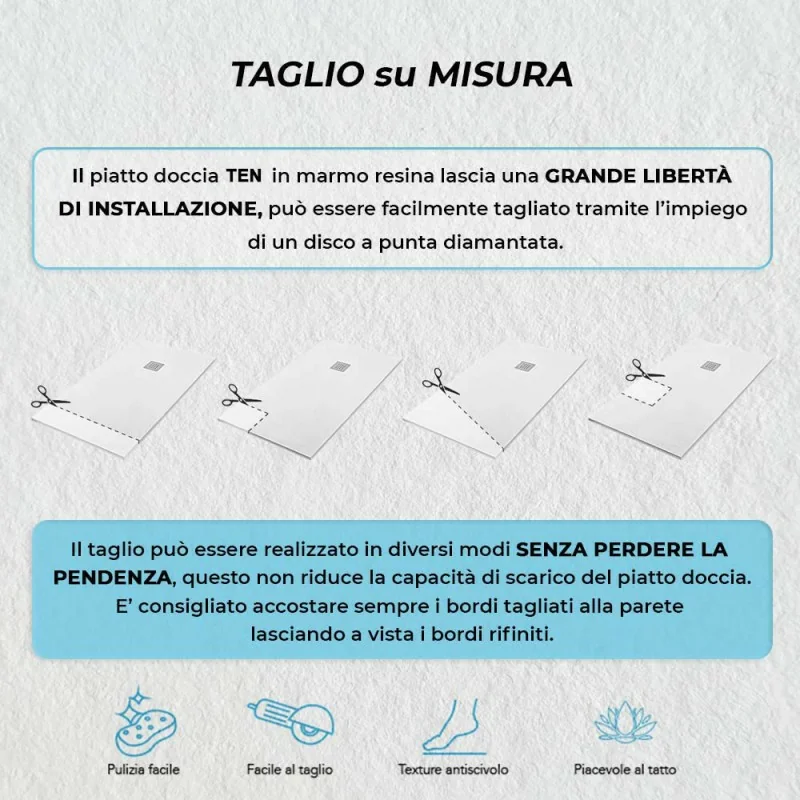 L’impiego della resina unito alle cariche minerali e al rivestimento Gelcoat,rende il piatto doccia particolarmente resistente e leggero,per una superficie antiscivolo e non porosa. Riducibile su misura,il piatto doccia può essere facilmente tagliato con l’ausilio di un disco diamantato.