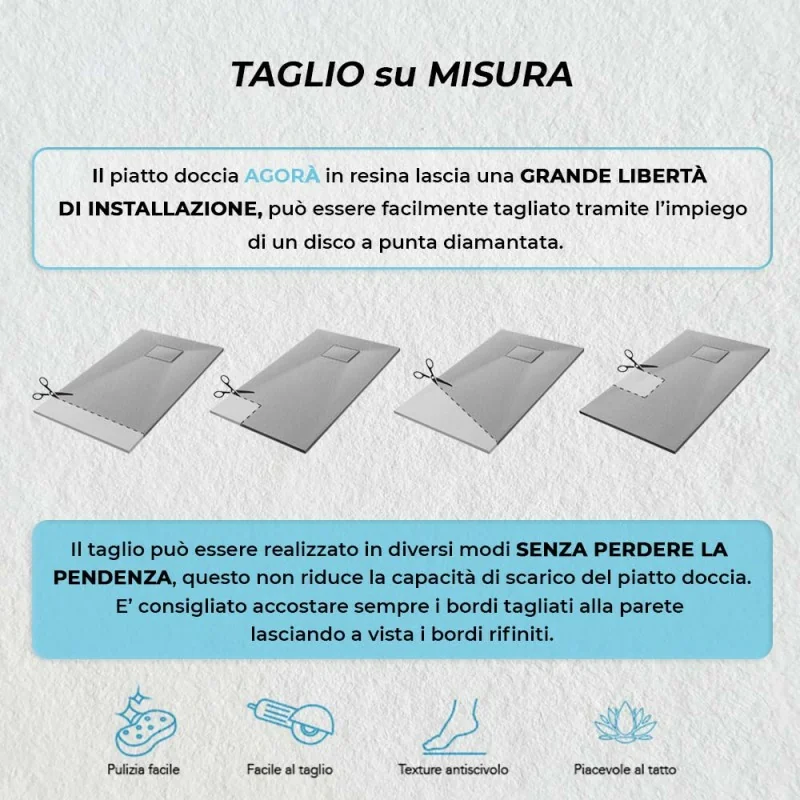 Il piatto doccia Agorà è riducibile su misura,ideale per risolvere i comuni problemi di fuori squadra nella propria zona doccia;può essere installato liberamente,in appoggio o filo pavimento grazie allo spessore di soli 3 cm. La superficie effetto pietra del piatto doccia è impermeabile e antiscivolo,in grado di prevenire il rischio di cadute.