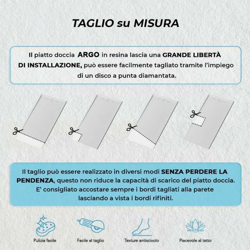 Il piatto doccia può essere liberamente installato sia filo pavimento che in appoggio,grazie allo spessore ridotto di soli 3 cm;è riducibile su misura,tagliabile con disco diamantato fino a misura desiderata.