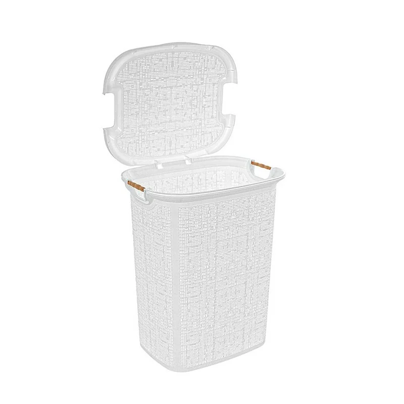 Cesto portabiancheria in plastica bianca con manici in legno capienza 60 lt