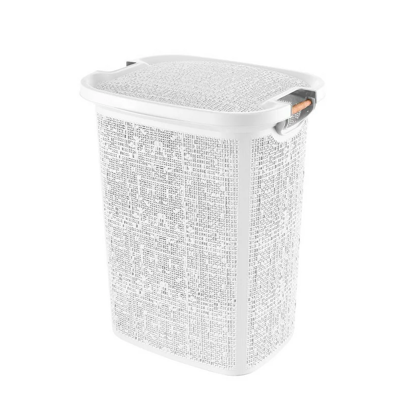 Portabiancheria design moderno con capienza 60 lt in plastica bianca dai motivi a intreccio e manici in legno