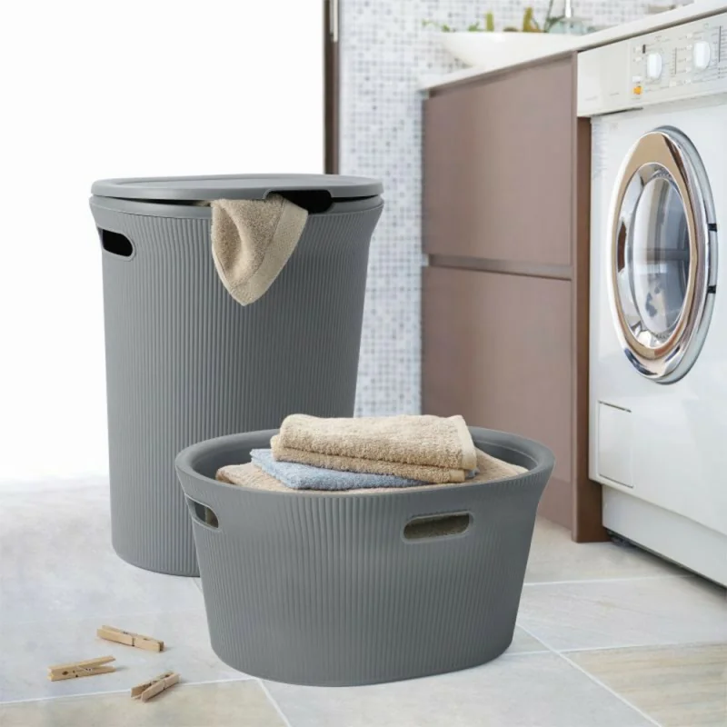 Colori tenui e design con ondulazioni verticali caratterizzano il nuovo cesto portabiancheria, dotato di apposito coperchio e fori laterali che assicura una facile impugnatura e un semplice trasporto anche a pieno carico.