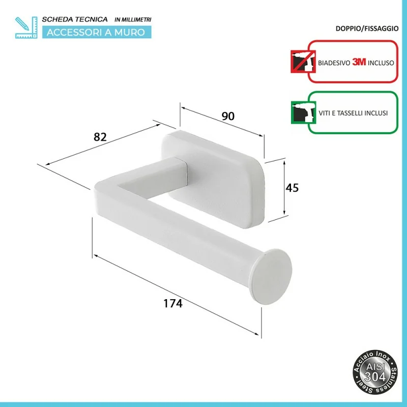 Il porta rotolo wc proposto dispone di fermo laterale e viene installato direttamente a parete, sfruttando una doppia modalità di fissaggio: biadesivo 3M o viti e tasselli, entrambi inclusi nella confezione.