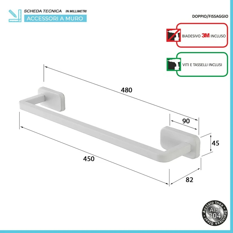 La barra portasciugamani proposta viene installato direttamente a parete,sfruttando una doppia modalità di fissaggio:biadesivo 3M o viti e tasselli,entrambi inclusi nella confezione.