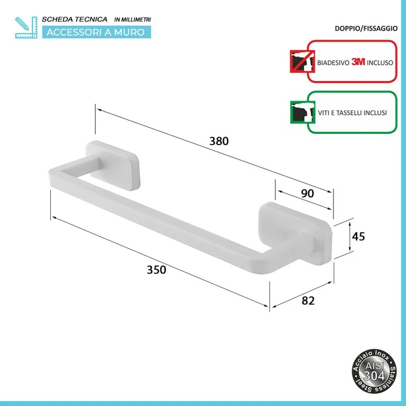 La barra portasciugamani proposta viene installato direttamente a parete,sfruttando una doppia modalità di fissaggio:biadesivo 3M o viti e tasselli,entrambi inclusi nella confezione.